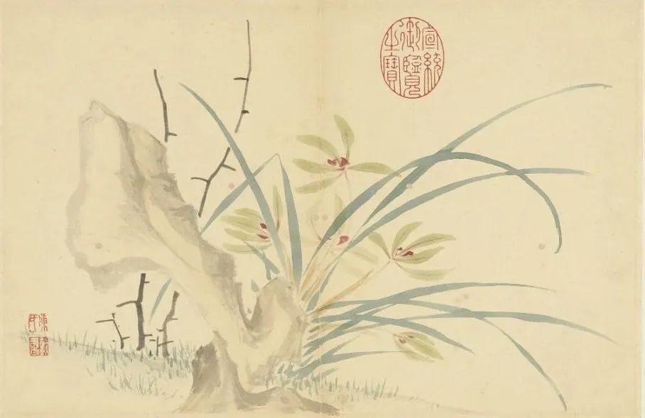 陈书以没骨法绘兰叶,淡墨直接点染花瓣与叶片,摒弃传统勾勒填色的程式。这种“去线条化”的笔法,暗合清代女性突破礼教束缚的生存状态——兰花斜倚奇石,棘条刺破画面,形成刚柔并济的张力。石块轮廓的模糊处理,恰似女性身份的流动性:既是嘉兴钱氏家族的“太淑人”,又是卖画自给的职业画家,更是以笔墨重构自然秩序的创作者。