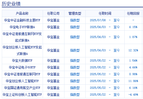 本次增聘曹旭辰共同管理的华宝中证金融科技主题ETF发起式联接、华宝中证金融科技主题ETF,两只基金规模共计81亿元,而华宝中证金融科技主题ETF近一年收益高达118.90%,业绩排名第三。